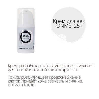 У марки ONME есть крем для кожи вокруг глаз от 25 лет. Крем разработан специально для нежной кожи и по своим свойствам напоминает ламеллярную эмульсию.
