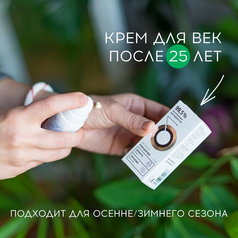 Крем на 99,5% состоит из натуральных ингредиентов. Это особенно важно в этом случае, ведь речь идет о самой тонкой и уязвимой коже — вокруг глаз.