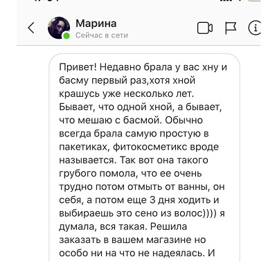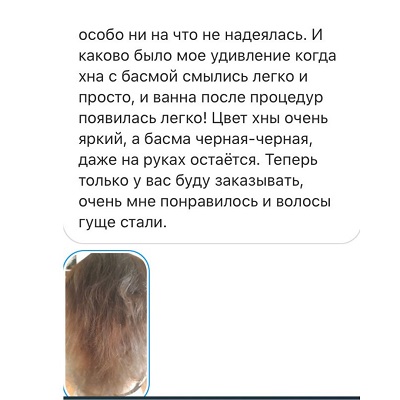 2. "Хна плохо вымывается, вся ванная будет рыжая, а в волосах останутся противные кусочки". Если хна некачественная, то именно так и может произойти. Но только не с хной из igreen.by Доказательство этому — отзывы наших покупательниц на сайте. А недавно мне пришел еще один отзыв в директ (см.ниже), где девушка пишет, что наша хна и басма отлично вымывается из волос и хорошо сохраняет цвет. Вот решила отзывом и с вами поделиться:)