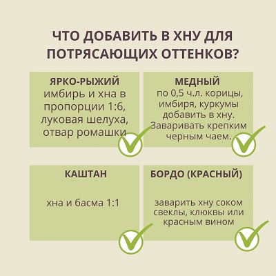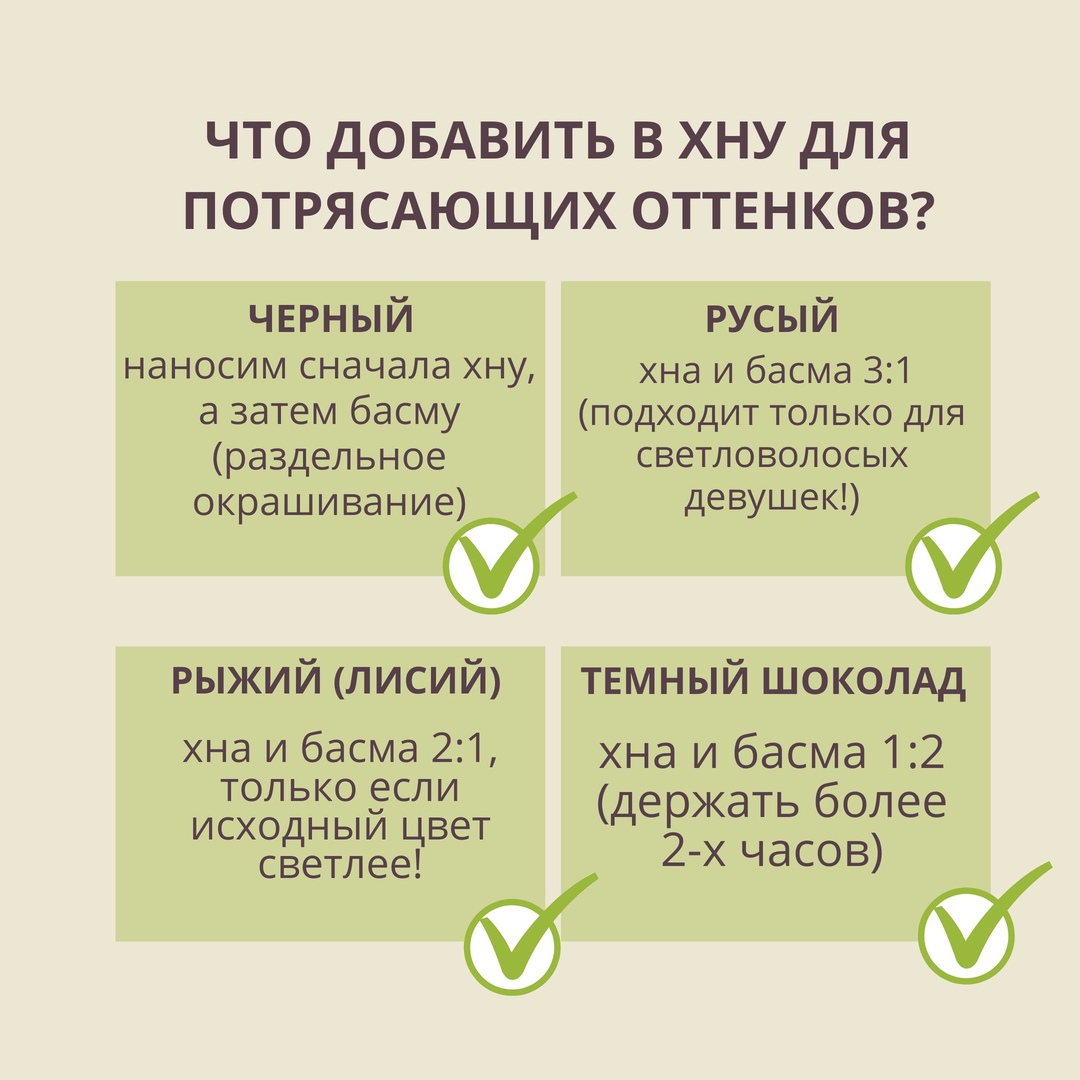 1. "Я не хочу быть рыжей!" И не нужно! Хна - это огромная палитра оттенков, от медно-русого до темно-каштанового. Нужно только знать, что в нее добавлять и как долго держать. В прикрепленных изображениях смотрите несколько вариантов того, что можно добавить в хну для получения различных оттенков. Но это далеко не все способы и их гораздо больше.